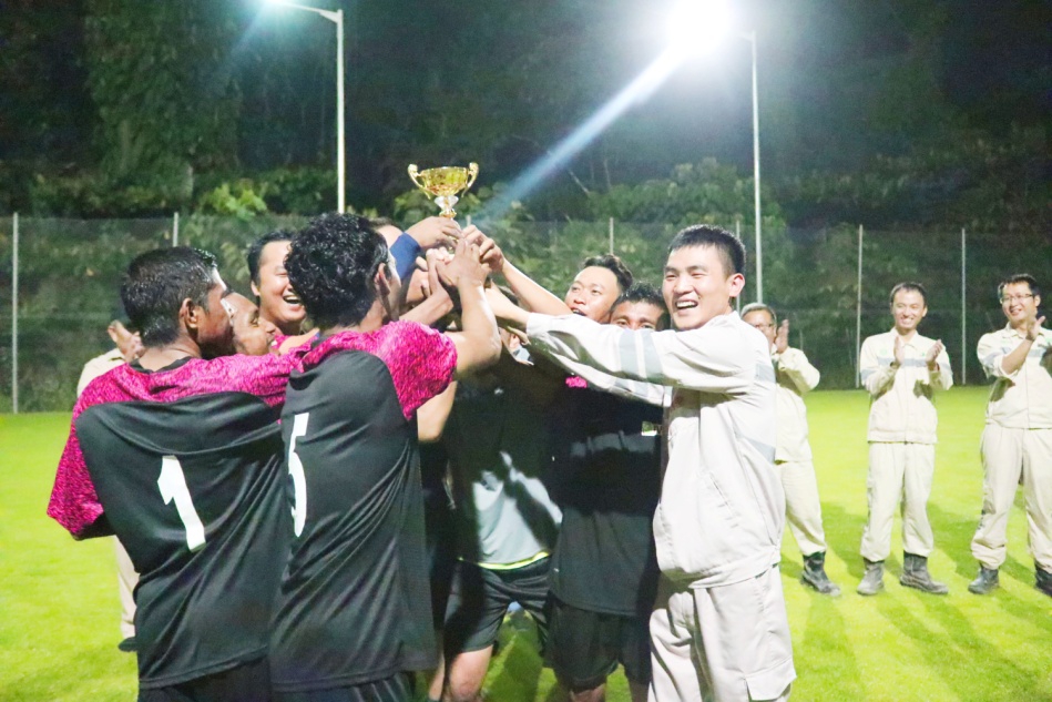 9月3日20时30分,在领导的大力支持和全体参赛人员、裁判员、工作人员的共同努力下,印尼纬达贝园区第一届员工趣味运动会圆满落幕,并在足球决赛结束后的热烈气氛中举行了颁奖典礼。永青集团有限公司董事长项炳和、副总裁何小振,以及各部门领导出席了颁奖典礼。