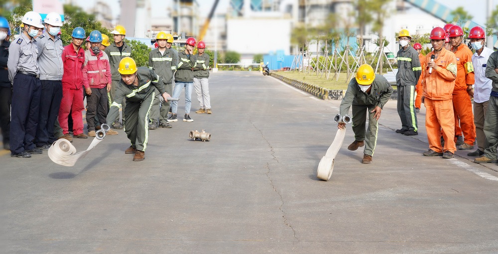 全体参演员工面对提前准备好的火堆,熟练地按照灭火的步骤和方法,将燃起的浓烟大火迅速扑灭。员工们还两人一组进行了消防水带抛接实操演练。